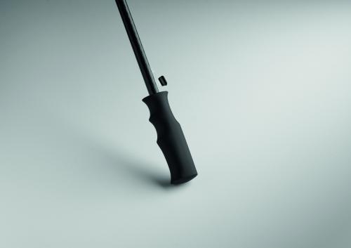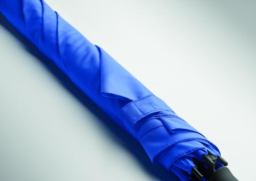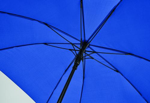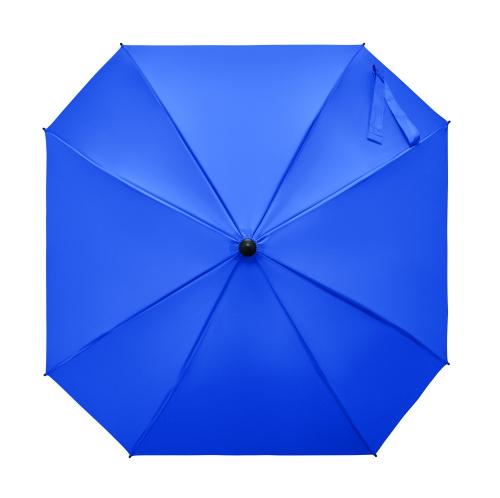 23-inch windproof auto-open square umbrella in 190T pongee polyester. Features full fibreglass frame and ribs, rubber-finished ABS handle.
