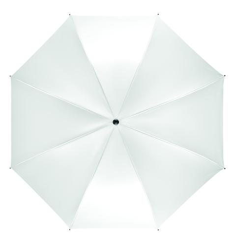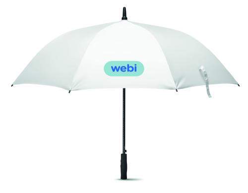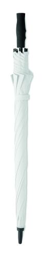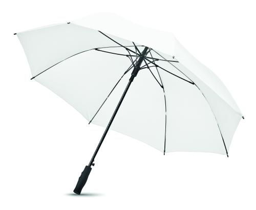 27 inch auto open windproof umbrella in 190T pongee with fiberglass shaft and ribs. Black plastic tips and top. Straight black ABS handle with rubberish finish. Manual closure.
