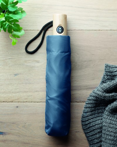 23 inch 3 fold auto open/close reversible umbrella in 190T pongee RPET. Fibre-glass ribs. Bamboo handle with cotton wrist strap. Includes matching RPET pouch. Bamboo is a natural product, there may be slight variations in colour and size per item, which can affect the final decoration outcome.