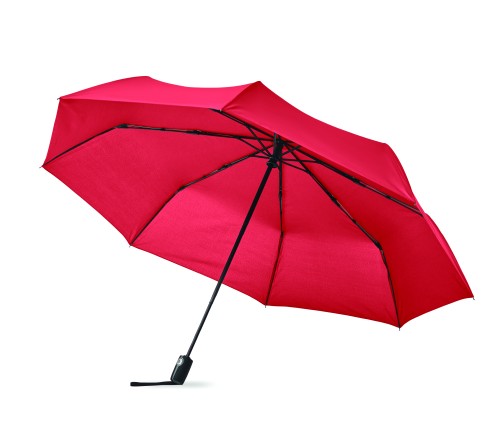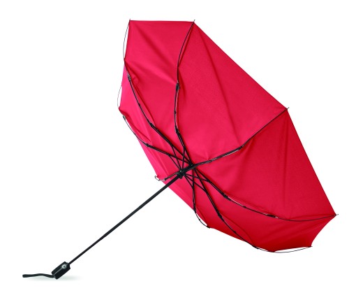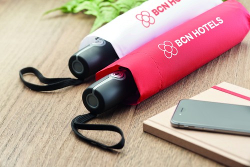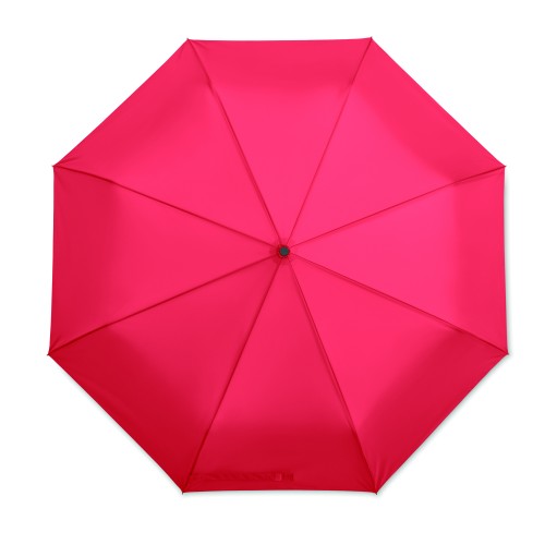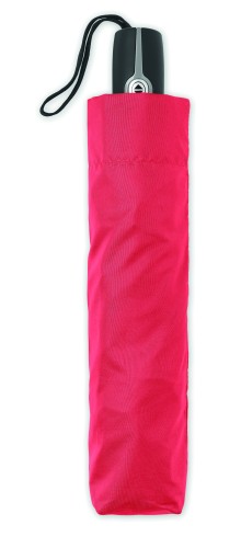 27 inch 3 fold auto open/close windproof umbrella. 190T pongee material black plated steel shaft. Fibreglass ribs, 1 part black plating inside frame. Black PP handle with button. With matching pouch.
