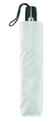27 inch 3 fold auto open/close windproof umbrella. 190T pongee material black plated steel shaft. Fibreglass ribs, 1 part black plating inside frame. Black PP handle with button. With matching pouch.
