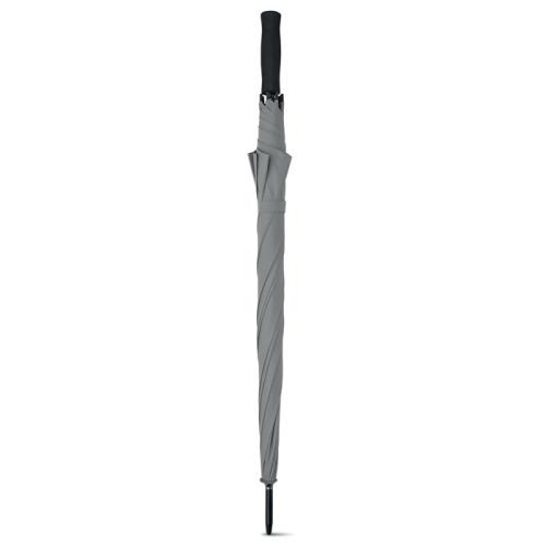 27 inch auto open umbrella in 190T pongee with black plated metal shaft and ribs. Black plastic tips. Straight black EVA handle. Manual closure.
