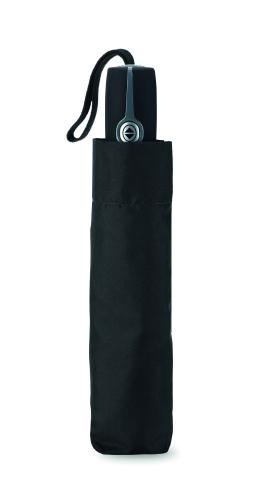 21 Inch Luxe 3 fold automatic windproof umbrella in 190T pongee with zinc plated steel shaft, black ribs with 2 sections fiberglass and chrome metal tips , black rubberised handle with doming. Includes matching pouch. Auto closure.