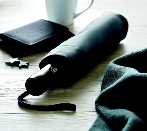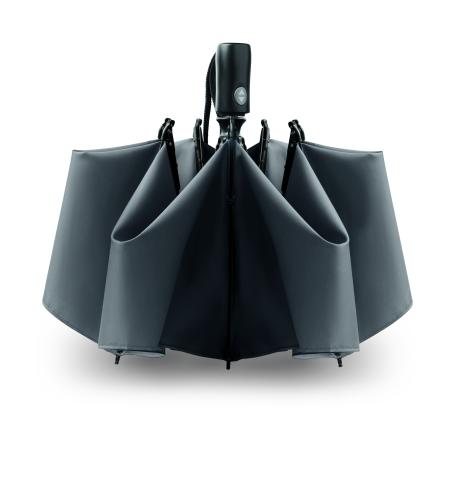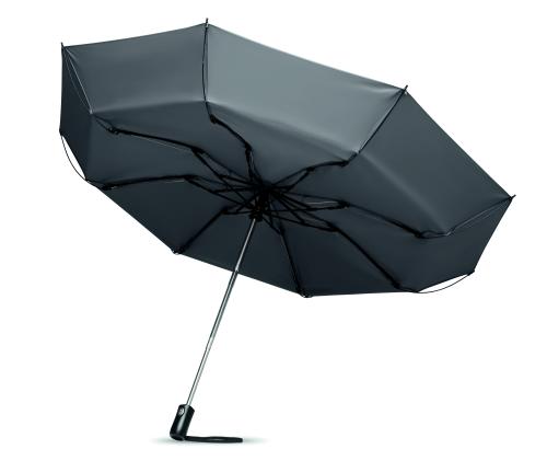 23 inch 3 fold auto open/close reversible umbrella in 190T pongee material chrome plating steel shaft. Fibre-glass rib and 1 part black plating inside frame. Black ABS handle with button. Includes matching pouch.