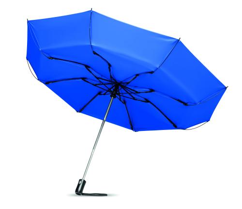 23 inch 3 fold auto open/close reversible umbrella in 190T pongee material chrome plating steel shaft. Fibre-glass rib and 1 part black plating inside frame. Black ABS handle with button. Includes matching pouch.