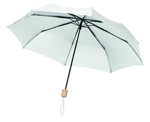 Foldable 21 inch umbrella, 3 sections with 190T RPET pongee fabric, black plated frame and ribs with wooden handle. Manual open and closure. Self material pouch.