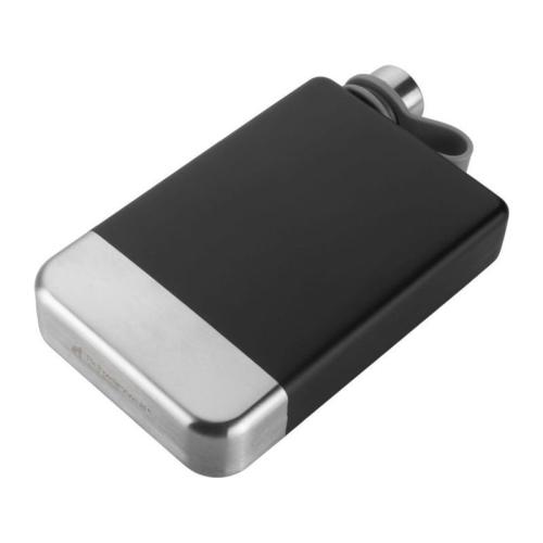 Schwarzwolf 266 ml hip flask. The flask is made of stainless steel with a smooth black coating. The Schwarzwolf logo is placed on the bottom of the flask. It is packed in a Schwarzwolf gift box.