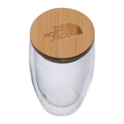 Double-walled cup with 500 ml filling capacity and lockable lid in bamboo.