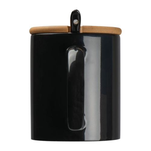 Ceramic mug with bamboo lid, matching recess for the spoon and a capacity of 300ml.