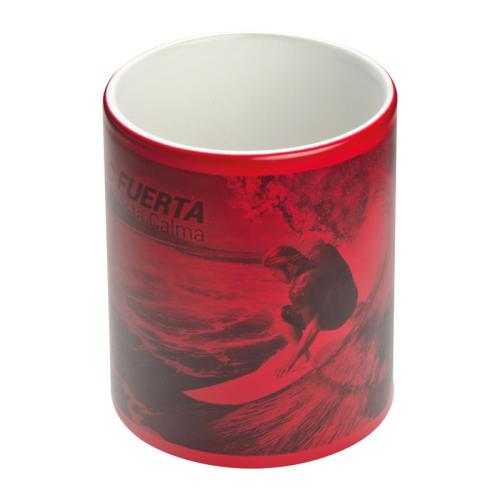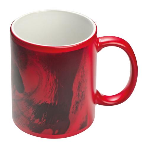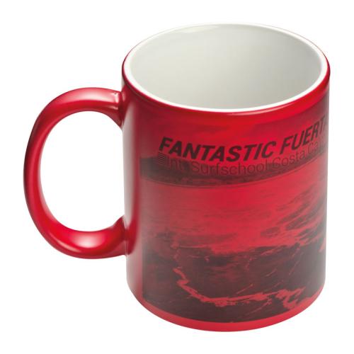 Effective sublimation mug: when cold the imprint vanishes under the coloured lacquering. As soon as hot liquid is filled in, the coloured imprint appears.