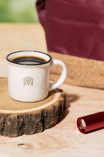 Mini vintage ceramic mug with black rim, white inside and coloured outside, 90 ml. In kraft paper box.