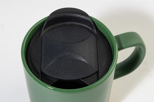 High quality ceramic mug with natural cork base and PP plastic drinking lid. With matte outside and glossy inside finish. 325 ml. In kraft paper box.