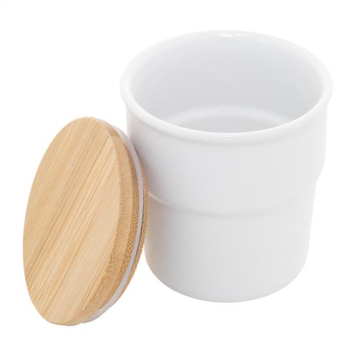 High quality ceramic cup with bamboo lid. With matte outside and glossy inside finish. 240 ml. In kraft paper box.