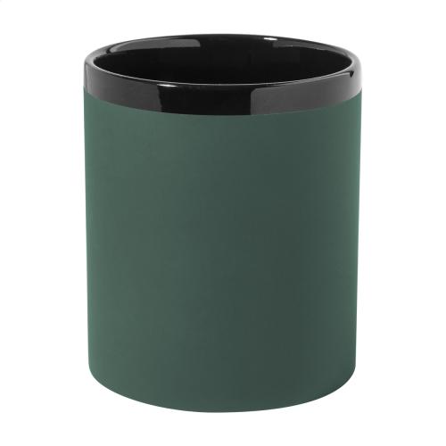 Ceramic mug with soft-touch rubberized finish and black inside and rim, 300 ml. With special coating for engraving, the engraved logo is matching the inside colour. In kraft paper box.