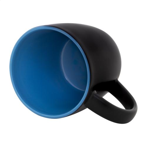 Black ceramic mug with coloured inside, 300 ml. With special coating for engraving, the engraved logo is matching the inside colour. In kraft paper box.