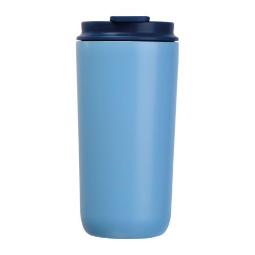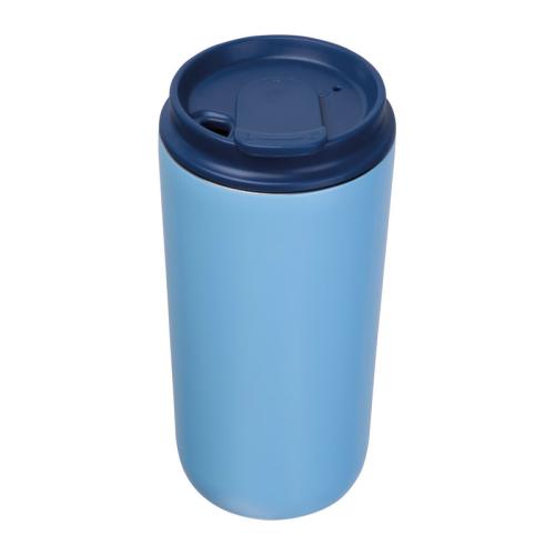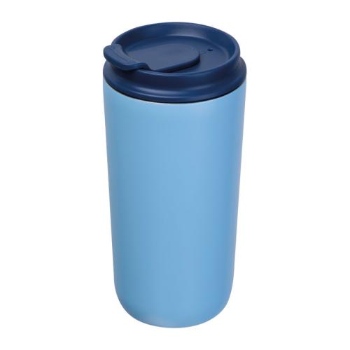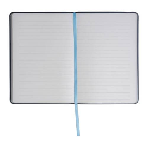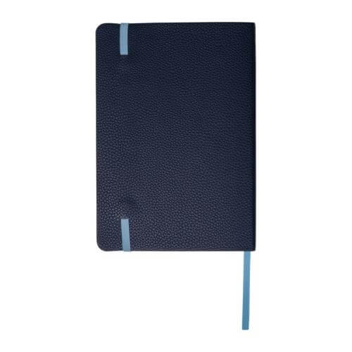 Set consisting of a notebook with 192 lined pages (96 sheets, A5, 100 g/m², recycled paper, PU cover with bookmark, rubber strap), a 500 ml stainless steel cup (leak-proof), and a high-quality aluminium twist ballpoint pen with blue ink.