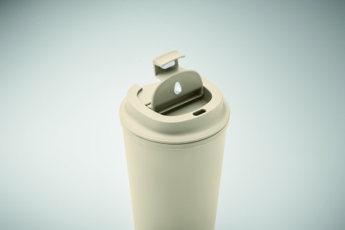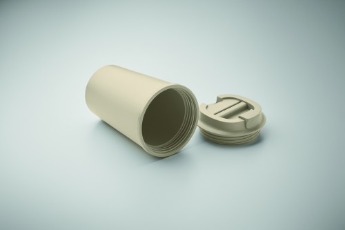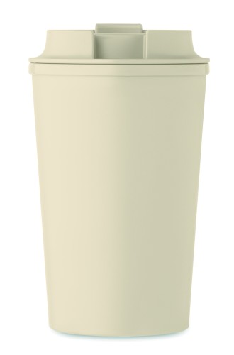 Double wall tumbler in 100% PLA corn with PP drinking lid with inner TPR. Leak free. Capacity: 350 ml.
