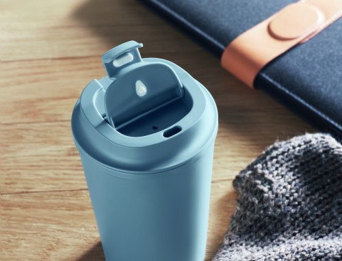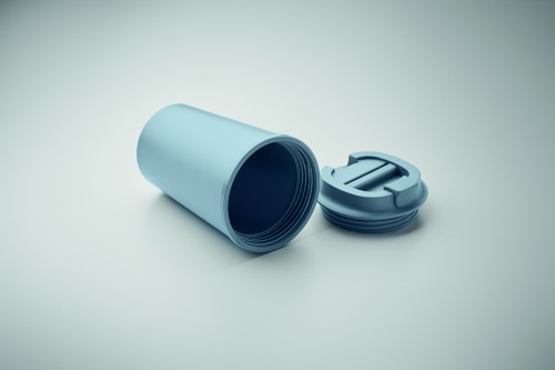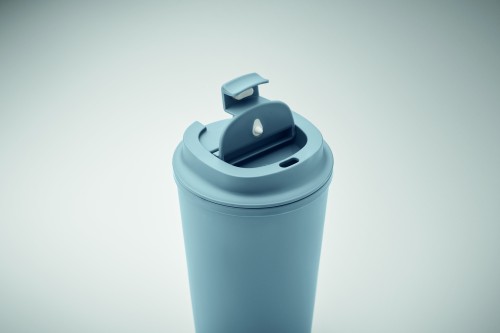 Double wall tumbler in 100% PLA corn with PP drinking lid with inner TPR. Leak free. Capacity: 350 ml.