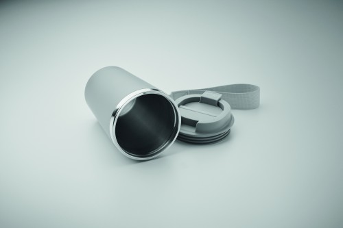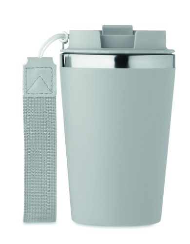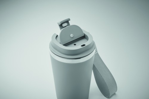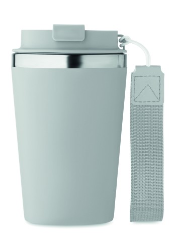 Double wall tumbler in recycled stainless steel (90% recycled stainless steel and 10% stainless steel) with PP outside layer with RPET wrist strap. Capacity: 350 ml.