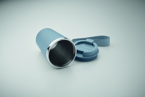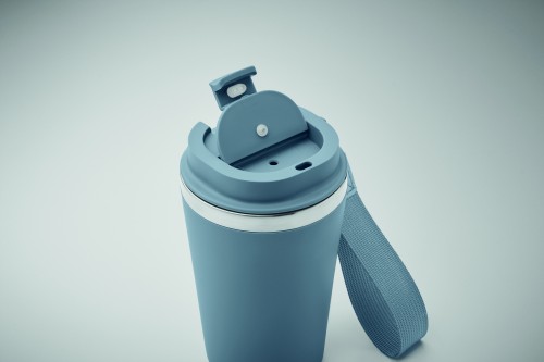Double wall tumbler in recycled stainless steel (90% recycled stainless steel and 10% stainless steel) with PP outside layer with RPET wrist strap. Capacity: 350 ml.