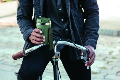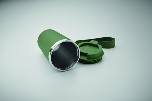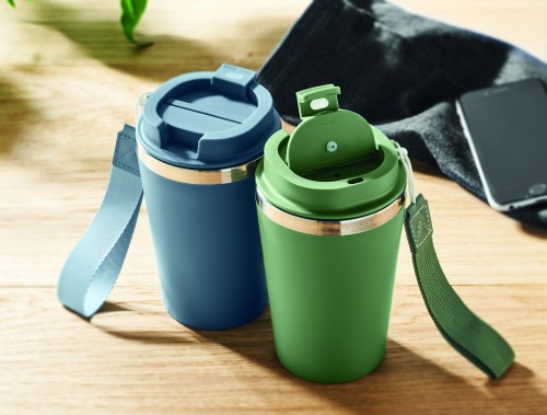 Double wall tumbler in recycled stainless steel (90% recycled stainless steel and 10% stainless steel) with PP outside layer with RPET wrist strap. Capacity: 350 ml.