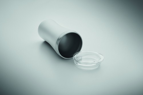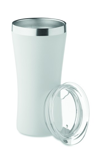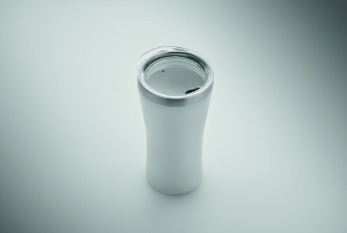 Small double wall vacuum insulated tumbler in recycled stainless steel (90% recycled stainless steel and 10% stainless steel) with drinking hole in the lid in transparent PP. Capacity: 160 ml.