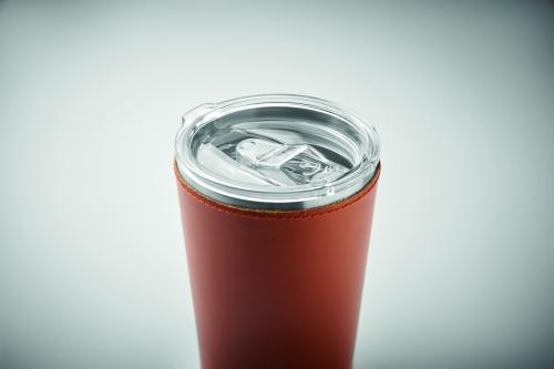 Double wall tumbler in recycled stainless steel (90% recycled stainless steel and 10% stainless steel) with removable PU leather sleeve. Lid with sliding sip hole. Leak-free. Capacity: 350 ml.