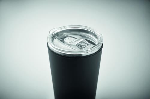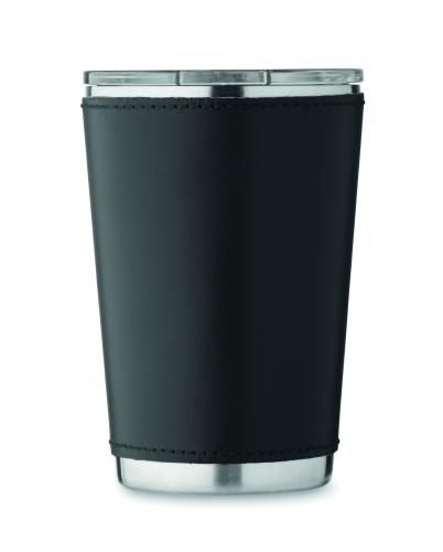 Double wall tumbler in recycled stainless steel (90% recycled stainless steel and 10% stainless steel) with removable PU leather sleeve. Lid with sliding sip hole. Leak-free. Capacity: 350 ml.