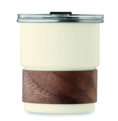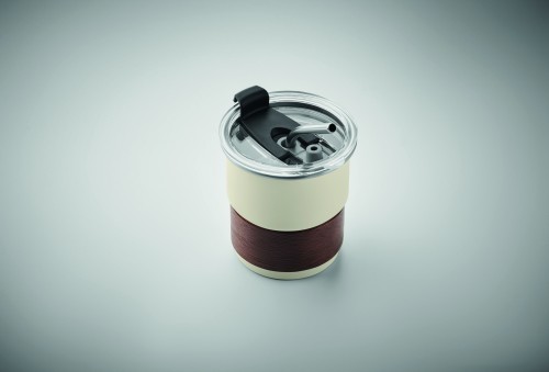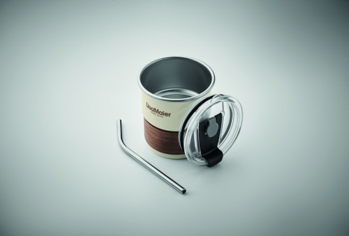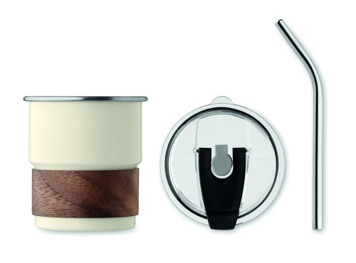 Single wall tumbler in recycled stainless steel (90% recycled stainless steel and 10% stainless steel) with a detachable grip in acacia wood, stainless steel straw. Straw socket and direct drink opening leak-free lid. Capacity: 260 ml. As this is a single walled mug, heat transfer can still occur.