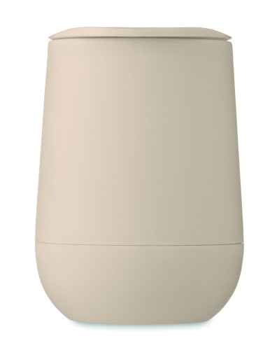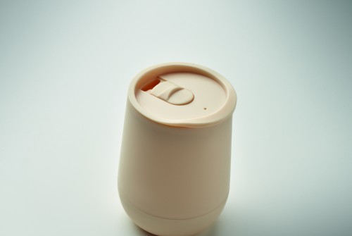 Double wall tumbler in PP with slide cover mouthpiece lid in PS and ABS. Capacity: 300 ml.