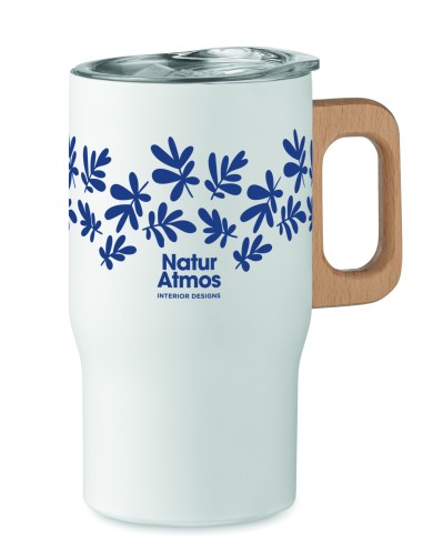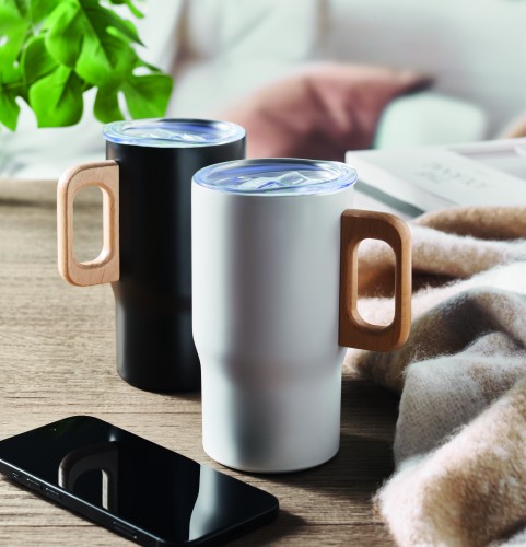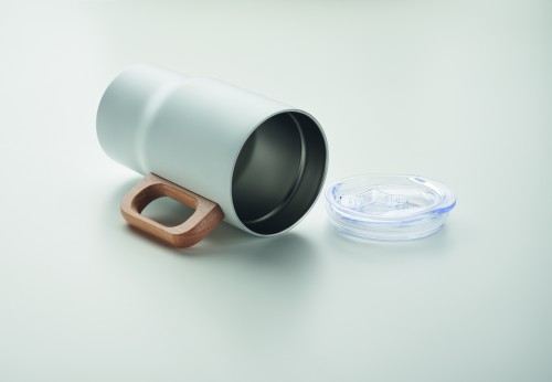 Double wall tumbler in recycled stainless steel (90% recycled stainless steel and 10% stainless steel) with wooden handle. Capacity: 350 ml.Leak-Free.