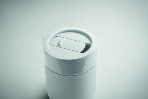 Ceramic tumbler with silicone sleeve and PP lid. Capacity: 330 ml.