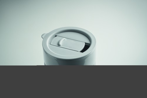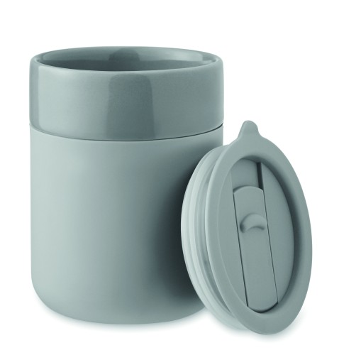 Ceramic tumbler with silicone sleeve and PP lid. Capacity: 330 ml.