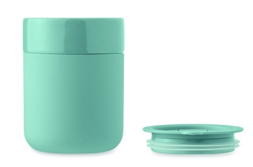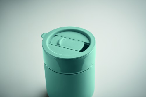 Ceramic tumbler with silicone sleeve and PP lid. Capacity: 330 ml.