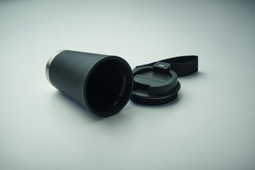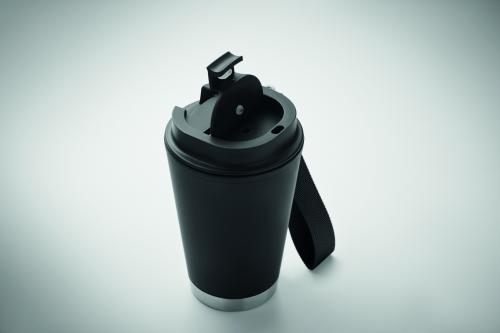 Double wall tumbler in PP inner wall, recycled PP outside wall, recycled stainless steel detail and RPET wrist strap. Capacity: 300 ml. Leak- Free.