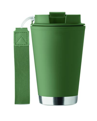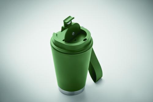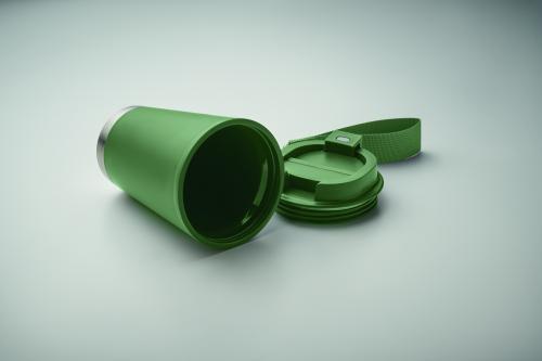 Double wall tumbler in PP inner wall, recycled PP outside wall, recycled stainless steel detail and RPET wrist strap. Capacity: 300 ml. Leak- Free.