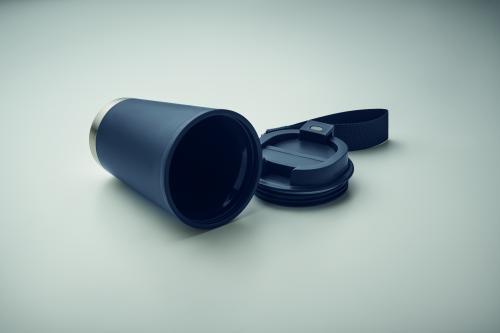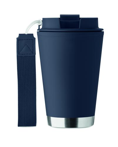 Double wall tumbler in PP inner wall, recycled PP outside wall, recycled stainless steel detail and RPET wrist strap. Capacity: 300 ml. Leak- Free.