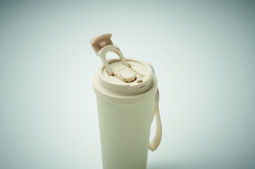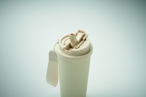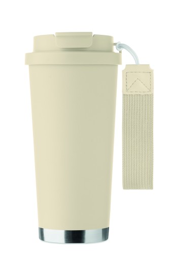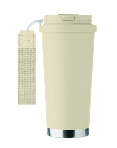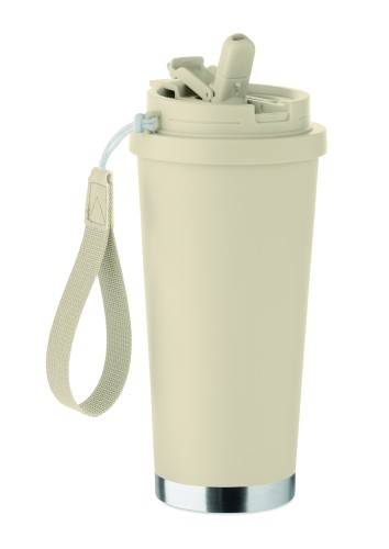 Double wall 90% recycled stainless steel (90% recycled stainless and 10% stainless steel) tumbler with PP lid (2-in-1 drinking sip and straw lid) and with RPET carry strap. Leak-free. Capacity: 500 ml.