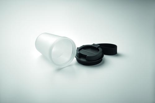Single wall tumbler in PP, with RPET polyester strap. Leak-free. Capacity: 300 ml. As this is a single walled tumbler, heat transfer can still occur.