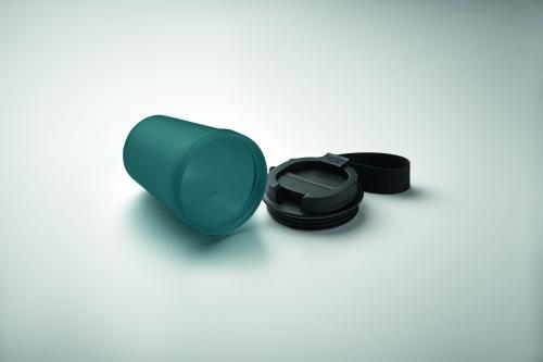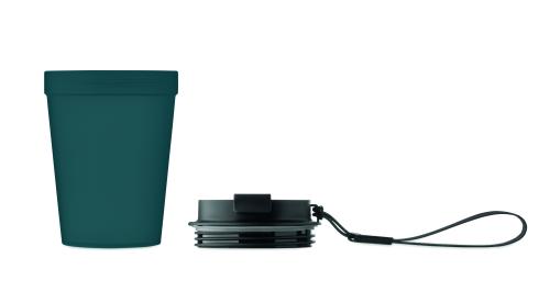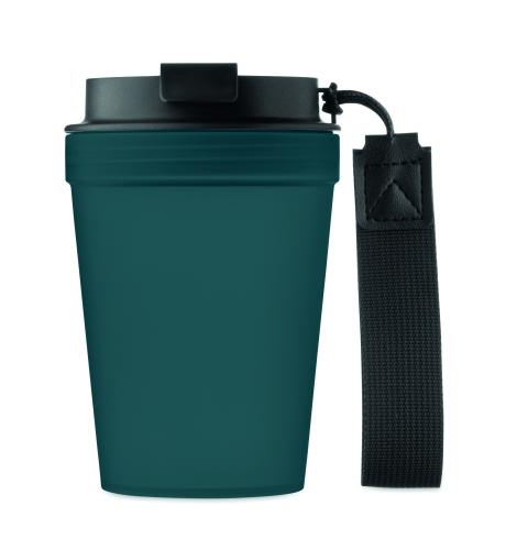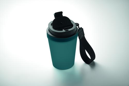 Single wall tumbler in PP, with RPET polyester strap. Leak-free. Capacity: 300 ml. As this is a single walled tumbler, heat transfer can still occur.