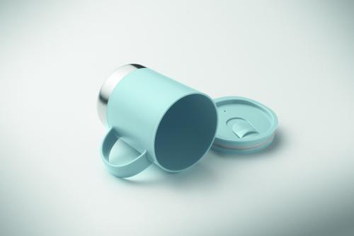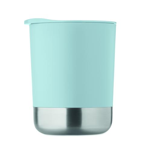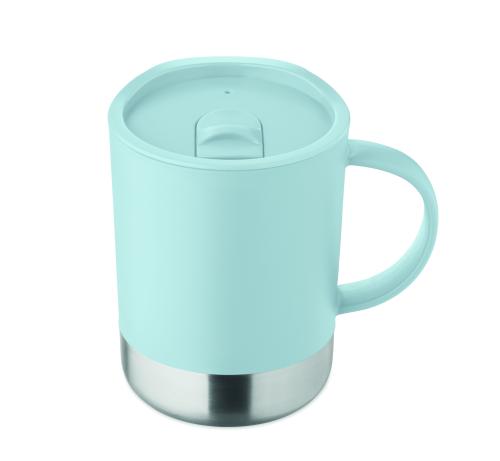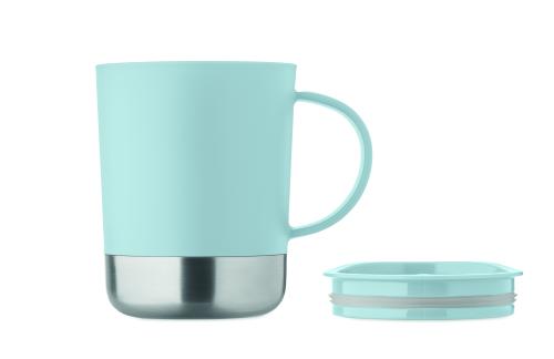 PP mug with recycled stainless steel base (90 % recycled stainless steel and 10% stainless steel) and PP sliding lid. Capacity: 300 ml.