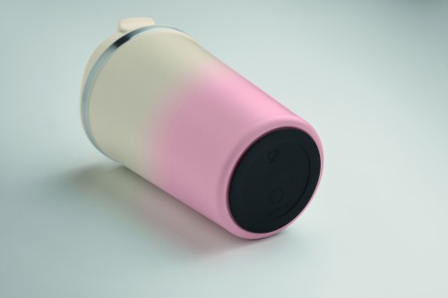 Double wall recycled stainless steel (90 % recycled stainless steel and 10% stainless steel) tumbler with PP lid. Capacity: 350 ml. Leak free.