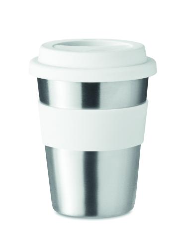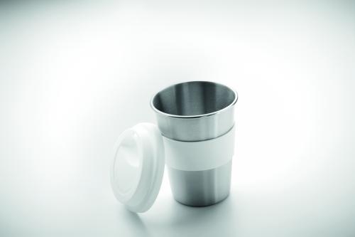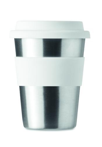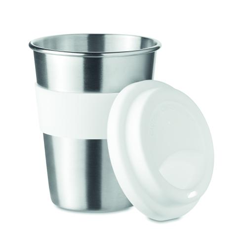 Stainless steel single wall tumbler with silicone lid and grip. Capacity 350 ml. As this is a single walled mug heat transfer can still occur.
