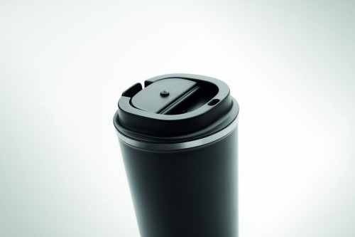 Double wall stainless steel tumbler with PP lid. Capacity: 350 ml. Leak free.