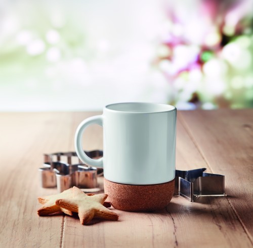 Ceramic mug with special coating for sublimation print and cork base detail. Individual packing in white carton box. Capacity: 300 ml Cork is 100% natural material. Due to its structural nature and surface porosity the final print result per item may have deviations.