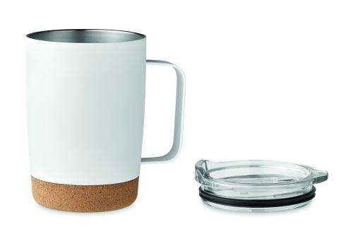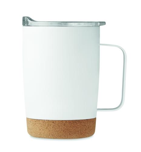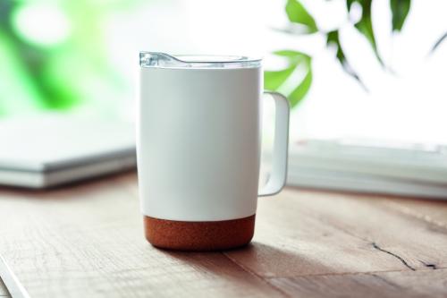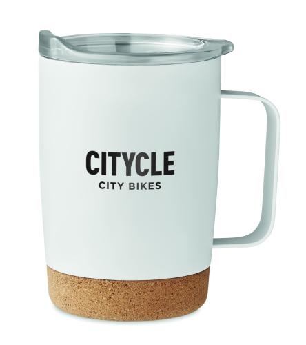 Double wall stainless steel mug with cork base and sliding sip hole cover. Capacity: 300 ml. Cork is 100% natural material. Due to its structural nature and surface porosity the final print result per item may have deviations. Leak-free.
