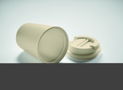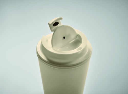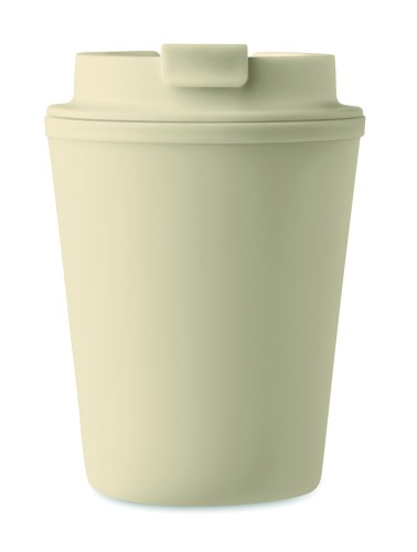 Double wall tumbler in PP. Capacity: 300 ml. Leak-free.