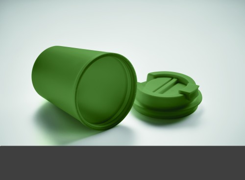 Double wall tumbler in PP. Capacity: 300 ml. Leak-free.