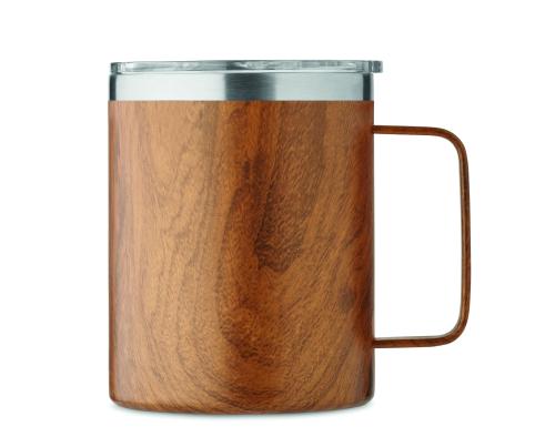 Double wall recycled stainless steel (90% recycled stainless and 10% stainless steel) mug with wooden look and sliding sip hole cover. Capacity: 300 ml.