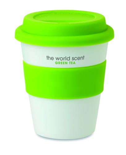 Single wall tumbler in shiny white PP with silicone lid and middle ring. Capacity 350 ml. As this is a single walled mug heat transfer can still occur.